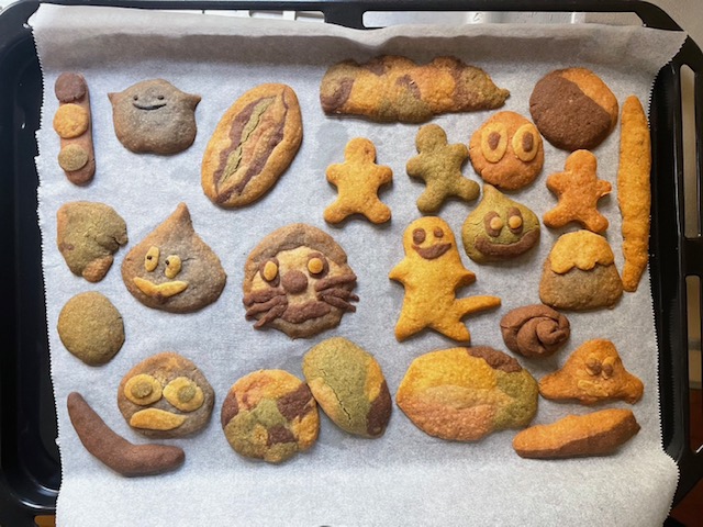 放射線科の福貞です。 先日、息子(23歳)からのお土産でクッキーを自分で型とって焼くタイプのお菓子セットを貰ったので早速作ってみました。ピンクはイチゴ味、青はブルーベリー味、白はバナナ味、黄色はレモン味、茶色はチョコ味で… 粘土の塊?いや、才能の塊です!