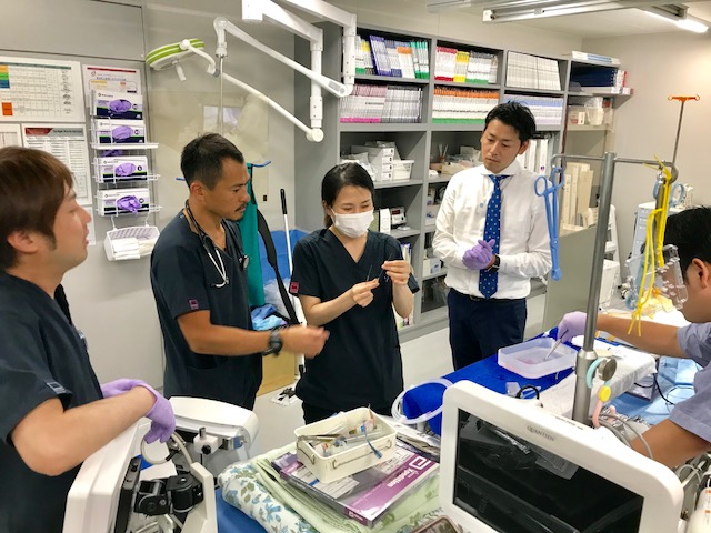 看護師の有村、樋口です。 実際のカテーテル検査・治療で使用する器具で、模擬血管にカテーテルを通す貴重な体験をしました。日ごろは薫平先生の隣でアシスタントをしていますが、自分が実際に体験してみると、非常に細や… ハンズオントレーニング