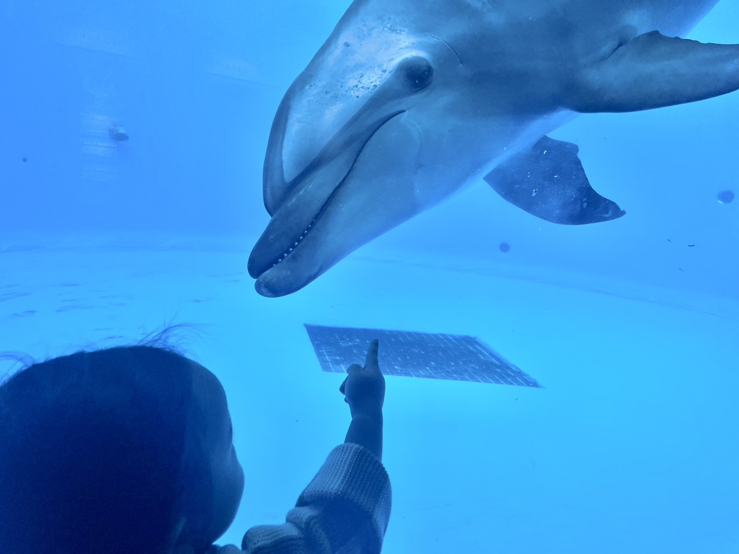 閉園間際のイルカの水槽は贅沢にも貸切状態となり、2頭のイルカたちが代わる代わる目の前に顔を合わせに回遊してくれる大サービス付きで、娘も息子も大喜びでした。