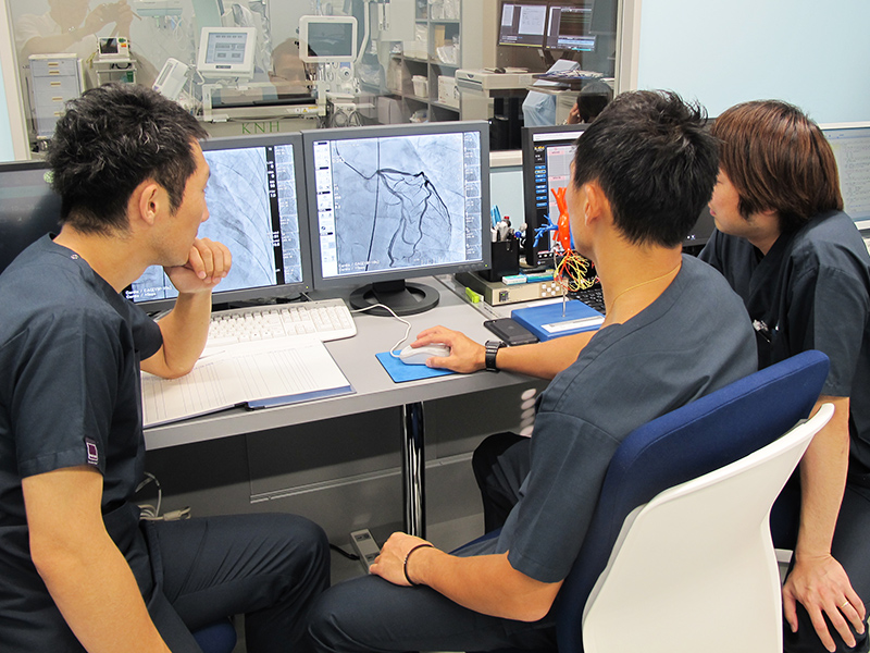 また、診断だけではなく、血管が狭くなっている部分や詰まっている部分には風船のついたカテーテルで広げたり、ステントと呼ばれる金属の管を留置し、血流を開通させる治療も行います。当院では患者様のQOL(Quality Of Life)を第一に考え、外科的手術に比べて侵襲性が低く、患者様に優しいカテーテル検査・治療に取り組んでいます。